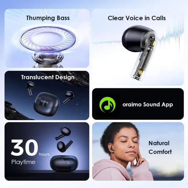 Clear Voice in Calls | Natural Comfort | Thumping Bass | 30-hour Playtime | Translucent Design | oraimo Sound App